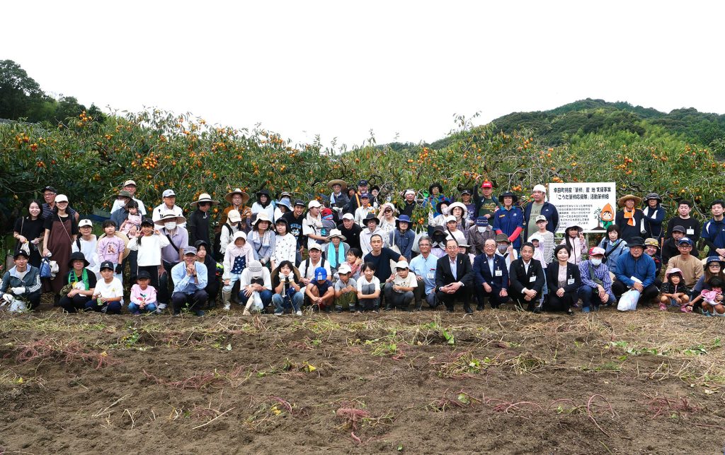 幸田町民、町内企業の従業員のご家族、26組103人が参加して、筆柿の収穫を行いました。数年間、耕作が行われなかった筆柿畑で、皆さんに剪定や摘果を行っていただいた結果、多くの木がよみがえり、たくさんの実をつけることができるようになりました。