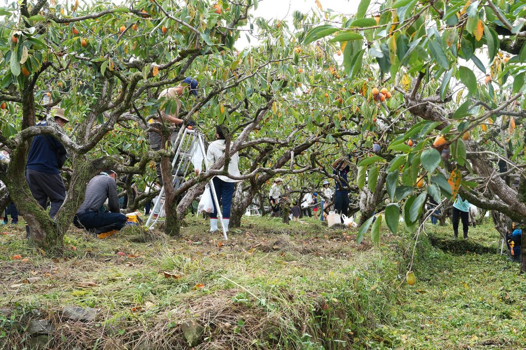 幸田町民、町内企業の従業員のご家族、26組103人が参加して、筆柿の収穫を行いました。数年間、耕作が行われなかった筆柿畑で、皆さんに剪定や摘果を行っていただいた結果、多くの木がよみがえり、たくさんの実をつけることができるようになりました。
