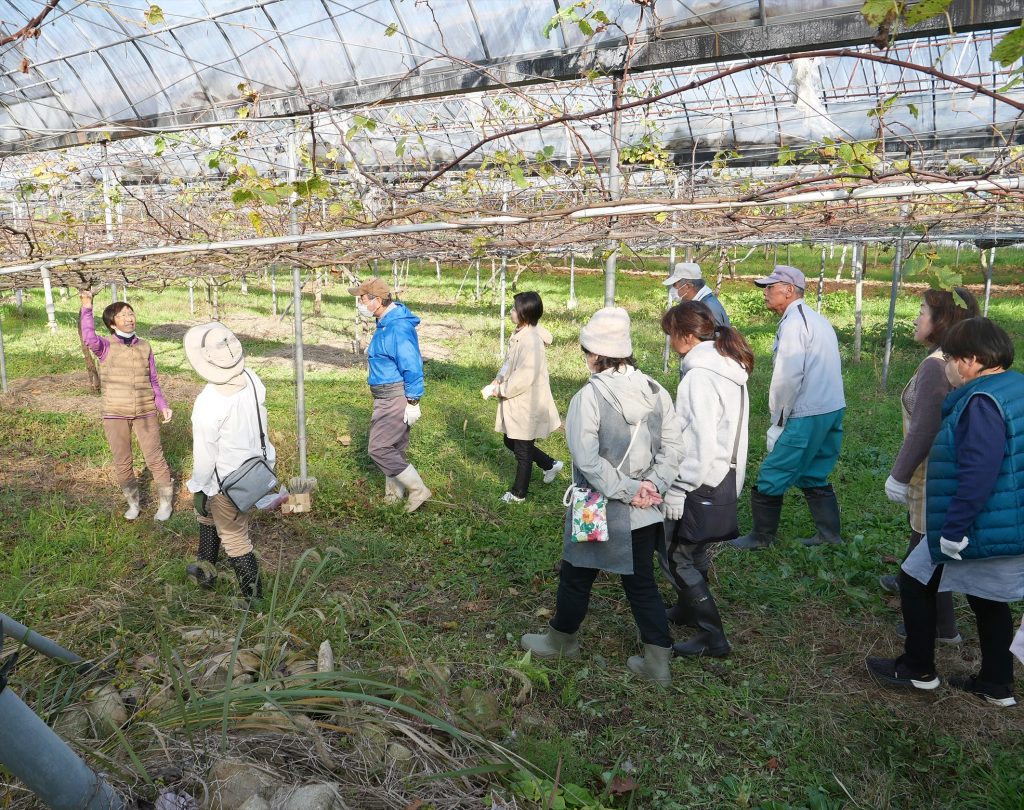 今回参加の皆さんには、ブドウ畑で収穫後の剪定作業に向けて、作業を妨げる枝の固定を外す、という作業をしていただきました。風で枝が折れるのを防いだり、葉がついた際にはまんべんなく陽が当たる適切な間隔を維持するために、ブドウの枝は棚に針金で固定されています。来年早々に予定されている剪定作業ではブドウを収穫後、肥料になる葉が全て落ちたあと、枝を切るわけですが、その際に邪魔になる針金を一本一本手作業で外します。そして来年また固定します。これを毎年繰り返さなければなりません。