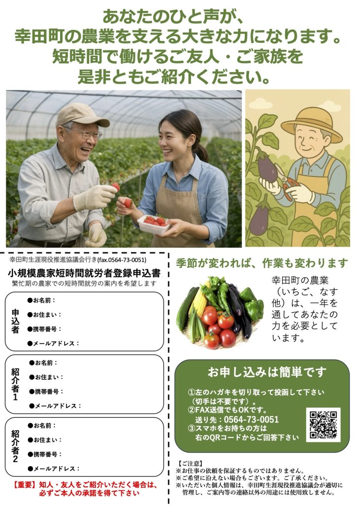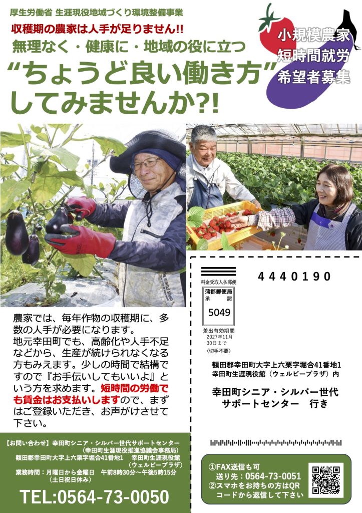 地元幸田町でも、高齢化や人手不足などから、生産が続けられなくなる方もみえます。少しの時間で結構ですので『お手伝いしてもいいよ』という方を求めます。短時間の労働でも賃金はお支払いしますので、まずはご登録いただき、農家からご要望があった際にお声がけさせて下さい(お仕事の紹介を保証するものではありません)。